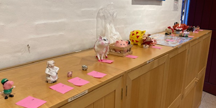 Vi startede med i fællesskab, at synge “Juletræet med sin pynt” og derefter læste Ole, H.C. Andersens dejlige historie “Pengegrisen” for os. Det var jo vel valgt, da vi alle havde en eller flere grise med, der skulle bedømmes og måske have en præmie. Men først skulle vi synge igen, denne gang “Glade Jul, dejlige Jul”.