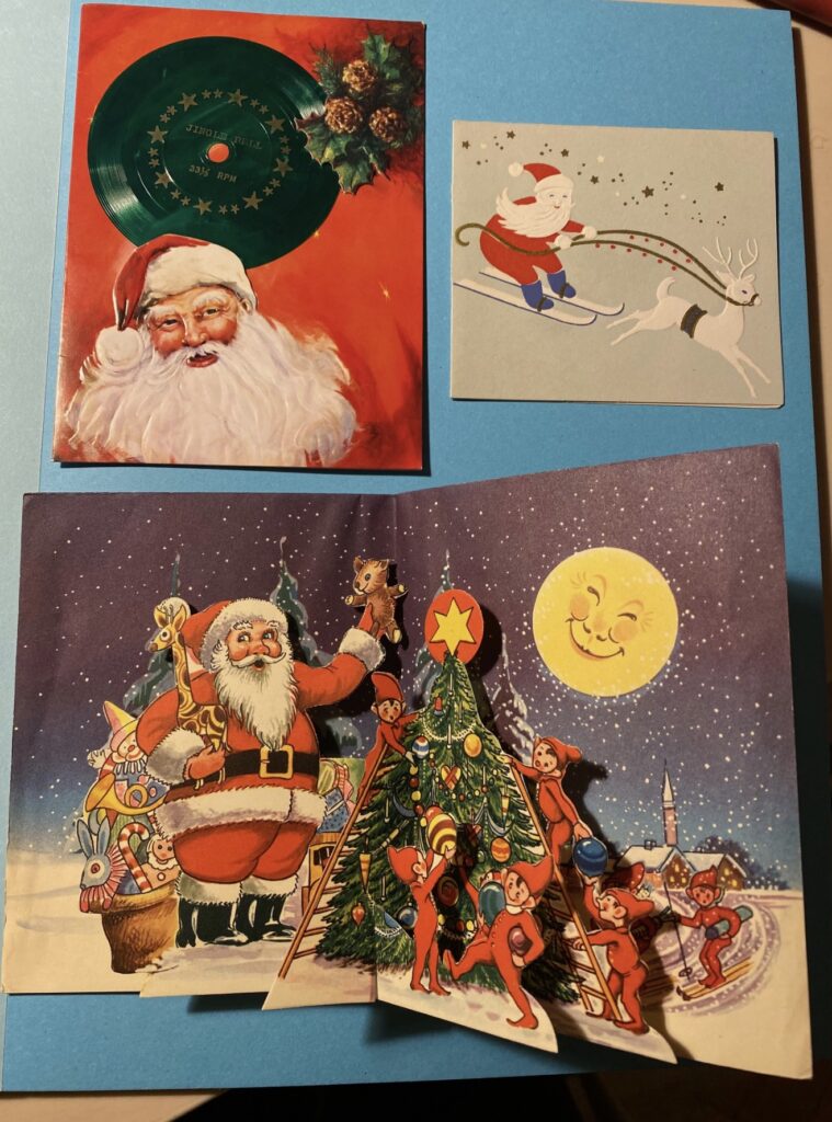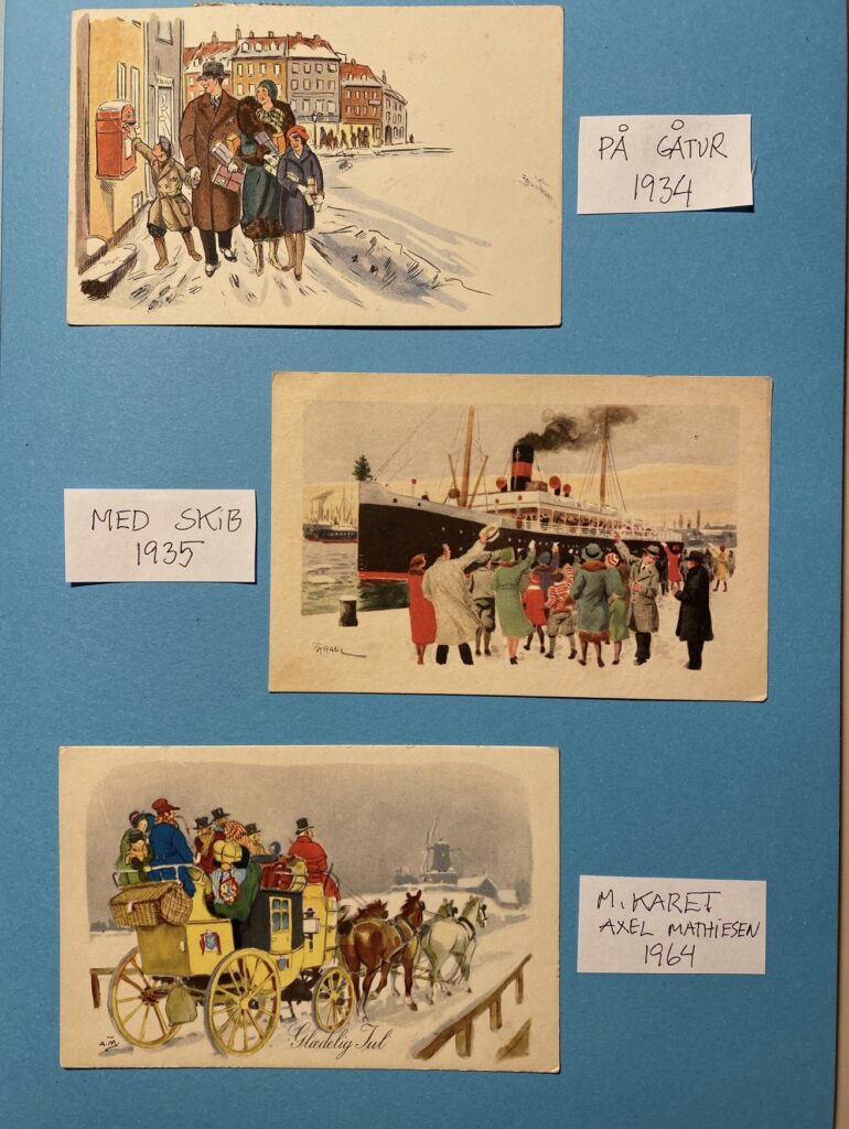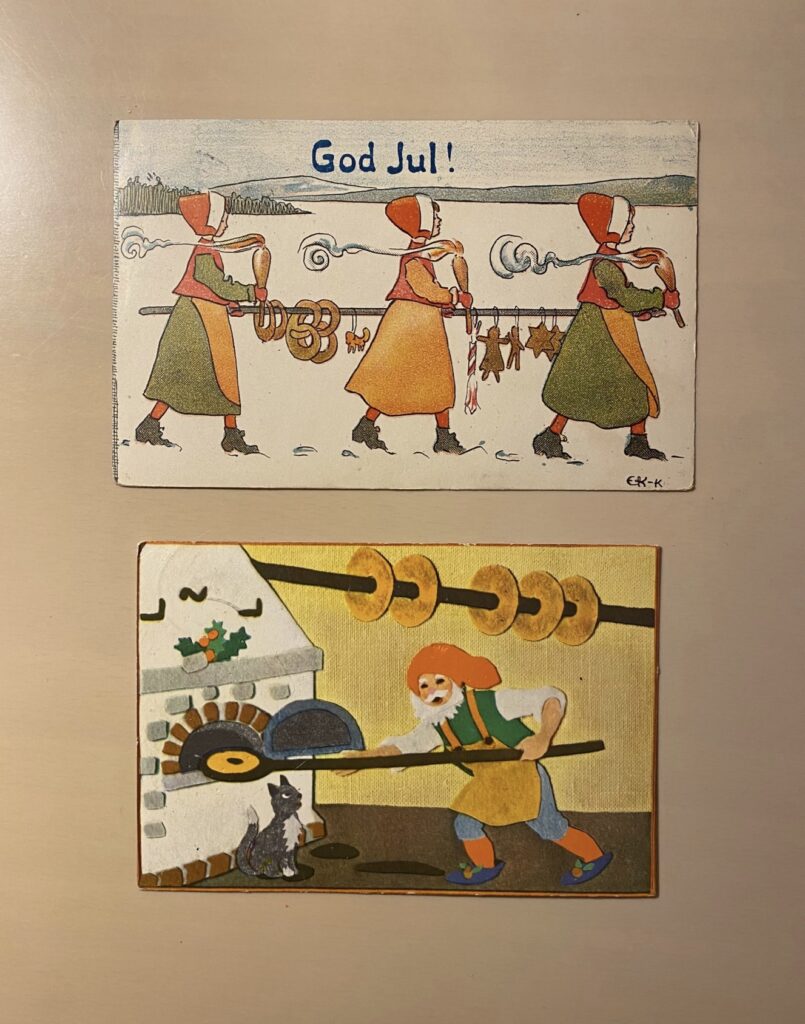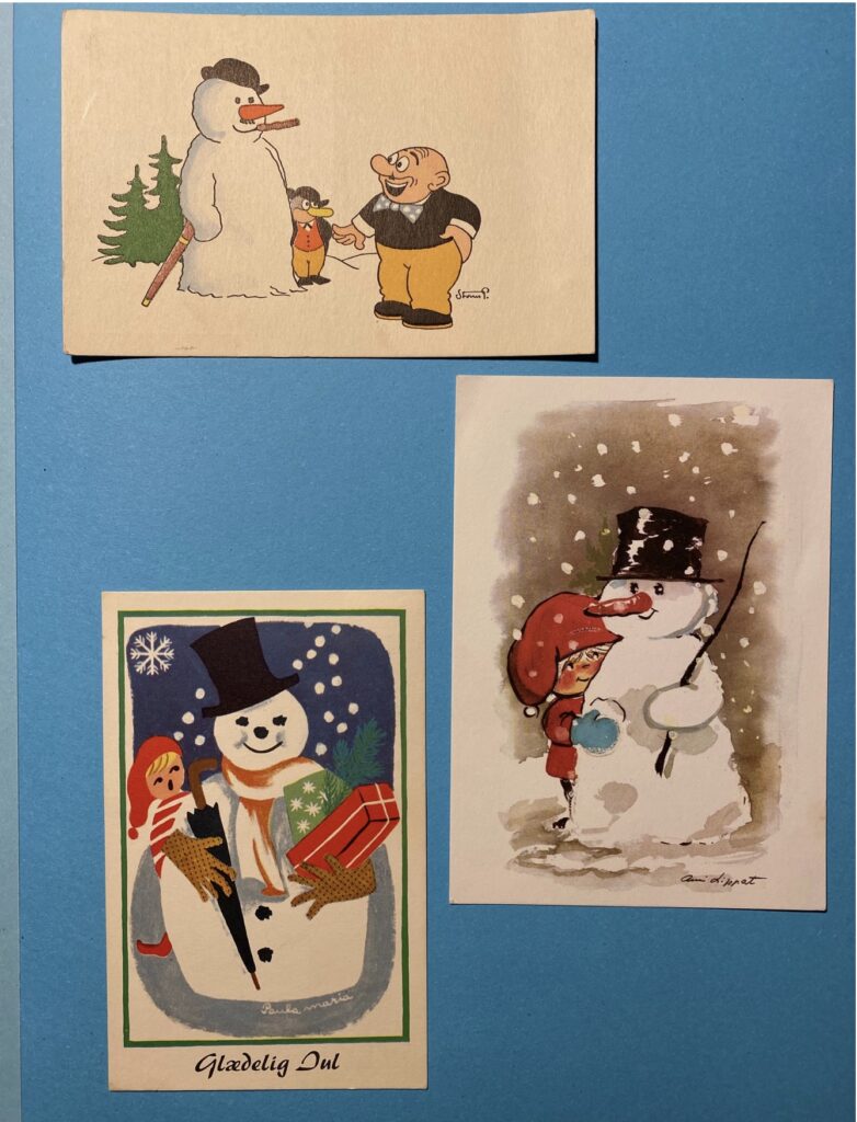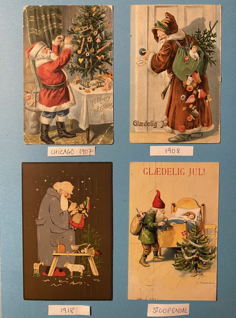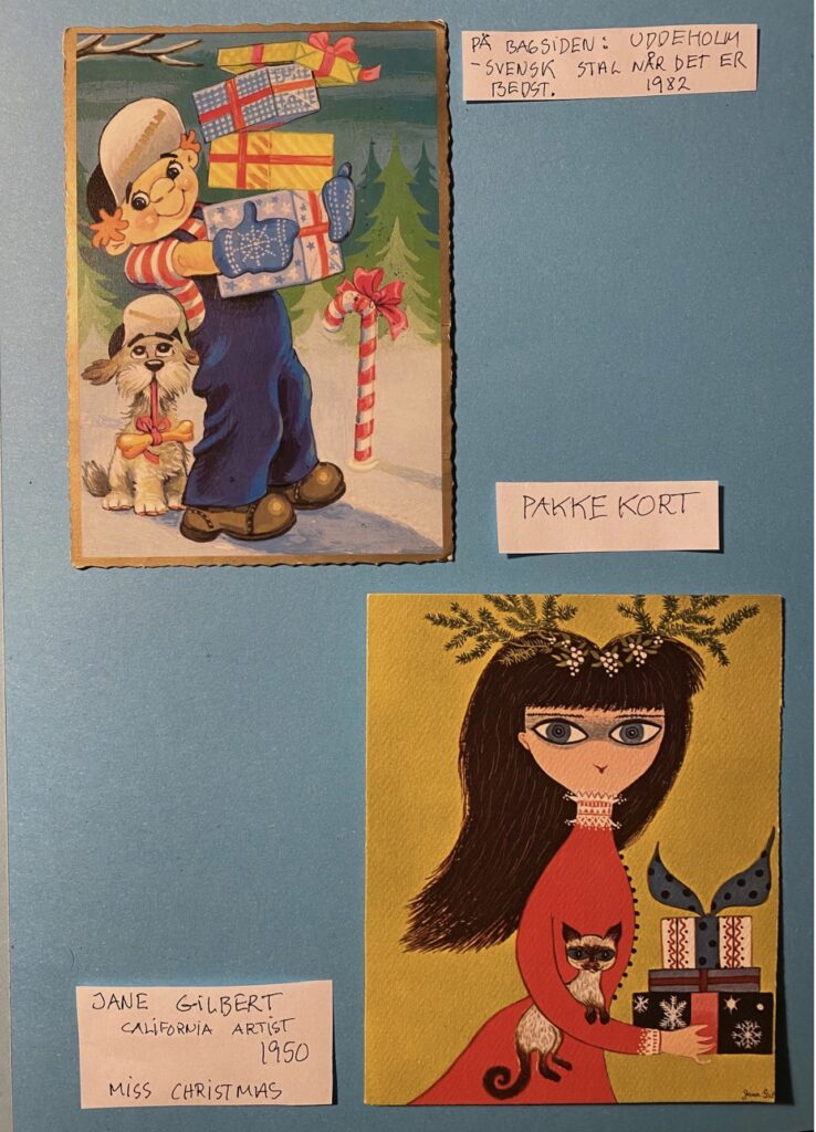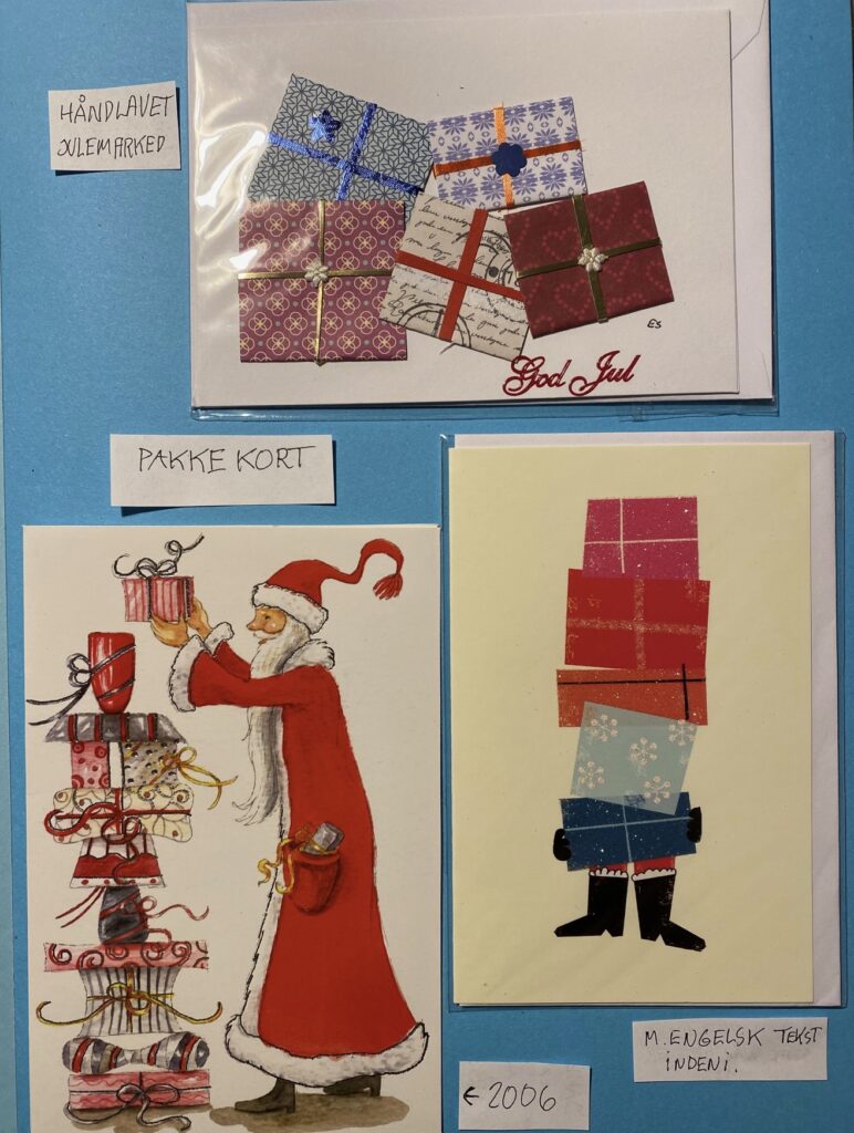 Nyere kort med pakkemotivee.Øverst Storm P, th. Lippert.Øverst: hvem har mon inspireret hvem i motivvalget?Kort med mini plade m Jingle Bells tv. Nederst med 3 D effekt.Ingen jul uden julemand.Kort med pakkerDen vigtige post og afsted til julefest.Transportområdet.Engle.Sne og stærke farver.Dobbeltkort forside og inderside.Dobbeltkort foroven, enkelt kort forneden.Formegentlig gl engelske kort. Dobbeltkort nederst.Svenske kort – brød på pind.Julen er børnenes fest.